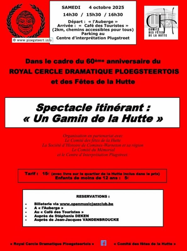 Cette année un spectacle itinérant se déroulera le samedi 4 octobre, il est intitulé : « Un gamin de la Hutte ». Ce spectacle est écrit par Bernard Baudour, auteur de plusieurs livres et qui connaît notre région par cœur. La réalisation de ce spectacle a été confié à Stéphanie Deken et Dorothée Lamoot avec le précieux concours des comédiens de la troupe du Royal Cercle Dramatique Ploegsteertois qui reprend ce spectacle dans le cadre des fêtes de son soixantième anniversaire.