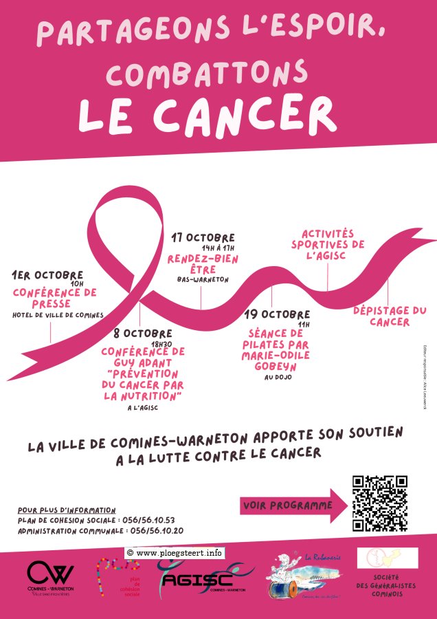 Ces actions ont pour objectif de rappeler que le dépistage précoce et l’information sont essentiels pour lutter efficacement contre le cancer. La Ville de Comines-Warneton souhaite, à travers ce programme, encourager chacun à s’informer, à prendre soin de sa santé et à soutenir les personnes touchées.