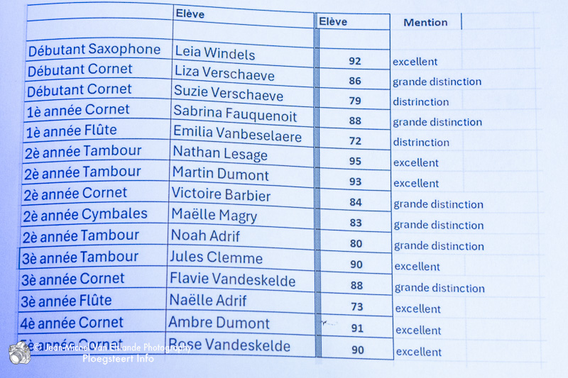 Ce samedi soir, quelques minutes avant le repas organisé pour soutenir l’école de musique et la société musicale, Vincent Vandeskelde a donc dévoilé les résultats de cette journée riche en stress pour les jeunes prodiges. Comme vous pouvez le constater dans les résultats ci-dessous, les jeunes élèves sont très doués.