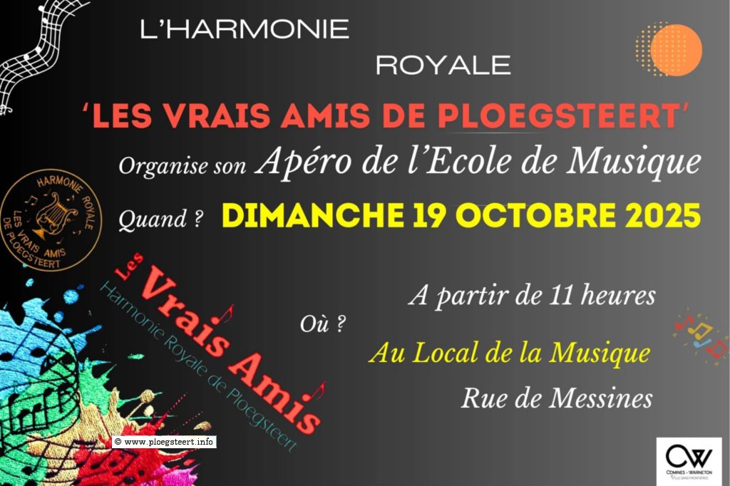 Ce dimanche 19 octobre, les musiciens de l’Harmonie « Les Vrais Amis » de Ploegsteert, vous donnent rendez-vous dès 11h, à l’espace musical de la rue de Messines (local situé près de l’ancien arsenal des pompiers), pour le traditionnel apéro afin de soutenir l’école de musique. Entre amis ou en famille, rejoignez cette équipe afin de soutenir les musiciens.