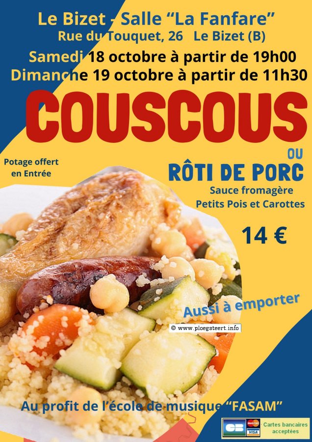 C’est ce week-end, à savoir ce samedi 18 octobre (19h) et dimanche 19 octobre (11h30), que toute l’équipe du « Royal Fasam Orchestra » vous convie à son couscous ou rôti de porc sauce fromagère dans la salle de la Fanfare, rue du Touquet au Bizet. Le prix du repas est fixé à 14€.