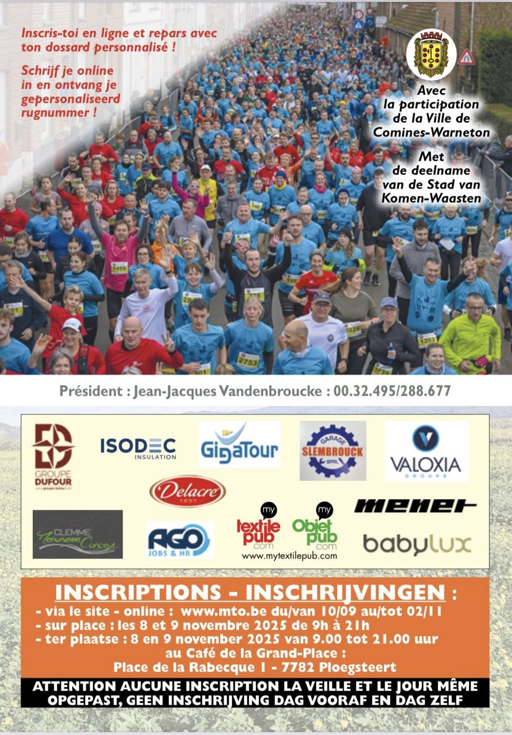 Inscription sur place et retrait des dossards le 8 et 9 novembre 2024 de 9h à 21h au café de la grand place, Place de la Rabecque 1 7782 Ploegsteert.
